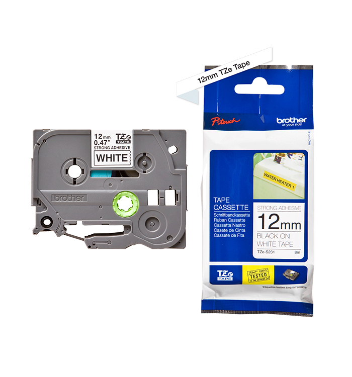 Inicio Tienda SUMINISTROS CINTA CINTA BROTHER Cinta Brother TZE-S231 Negro sobre Blanco 12mm (1/2″) x 8 mts