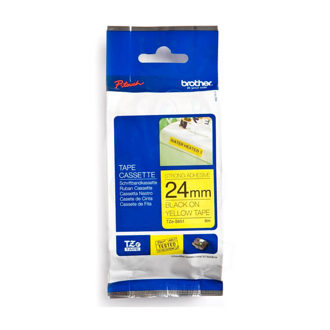 Inicio Tienda SUMINISTROS CINTA CINTA BROTHER Cinta Brother TZE-S651 Negro sobre Amarillo 24mm (1″) x 8 mts
